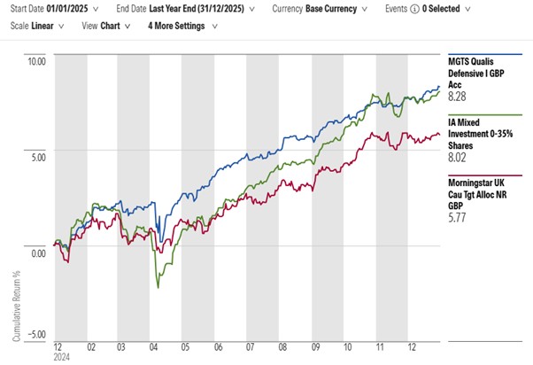 Against a backdrop of shifting rate expectations, uneven inflation data and frequent market mood swings, MGTS Qualis Defensive returned +8.28% in 2025, outperforming its benchmark by +0.26%, while also delivering the lowest drawdown in its sector during a year that tested diversification.